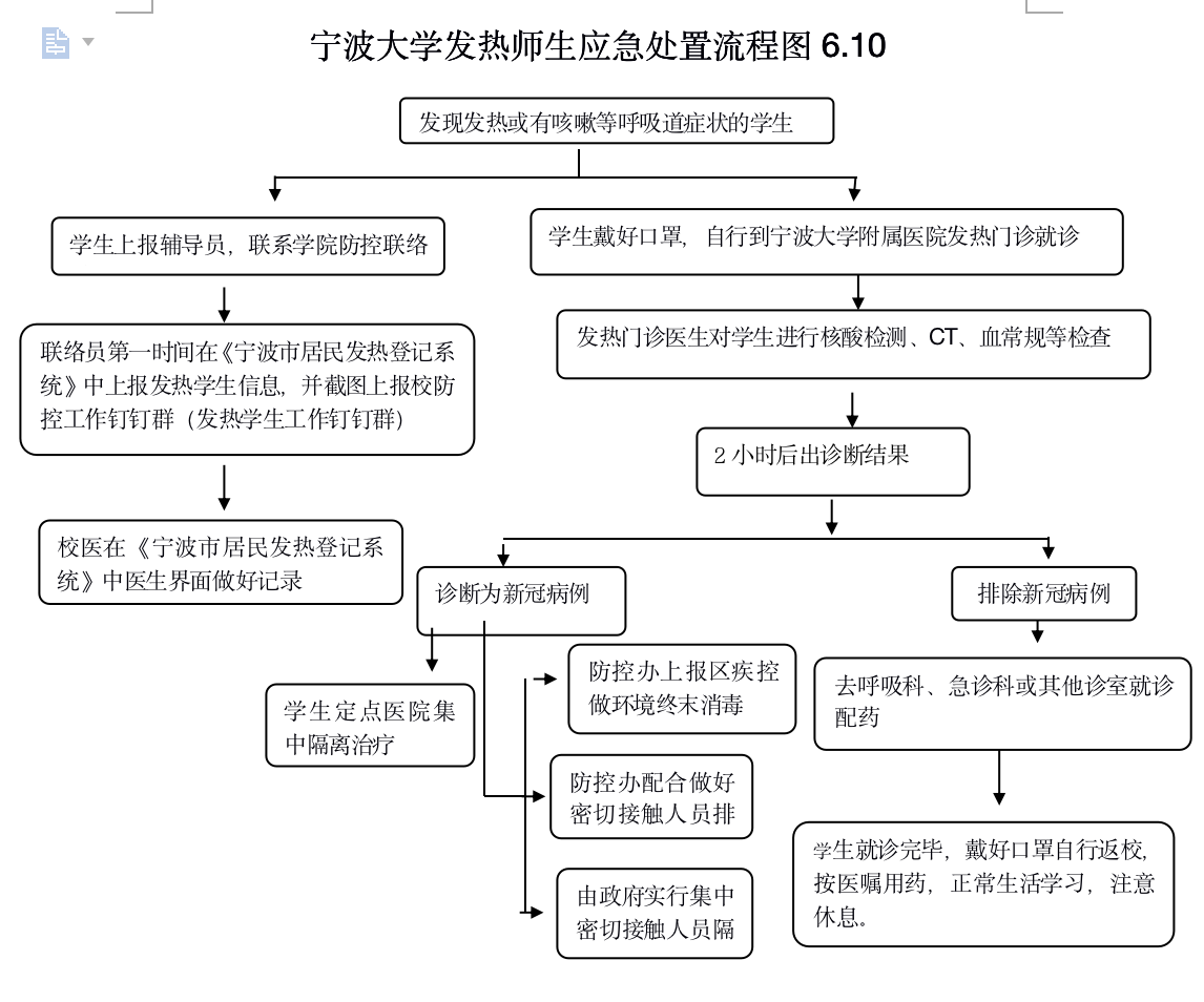 发热师生应急处置流程》进行处置。相关工作人员要熟悉突发事件应急处置流程,遇有紧急或突发事件要第一时间妥善处置,并按规定及时向分管领导和有关部门报告。