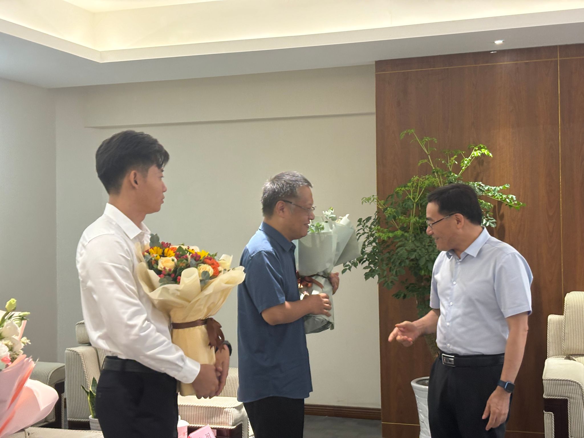 蔡荣根还为三位老师送上鲜花,向他们表达慰问和祝福。三位老师感谢学校对一线教师的关心关爱,表示将牢记“为党育人、为国育才”的初心使命,把教育家精神转化为育人实践,为学校和社会培养更多拔尖创新人才。