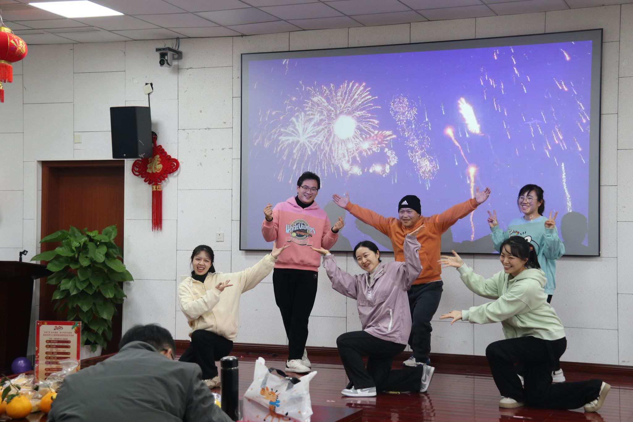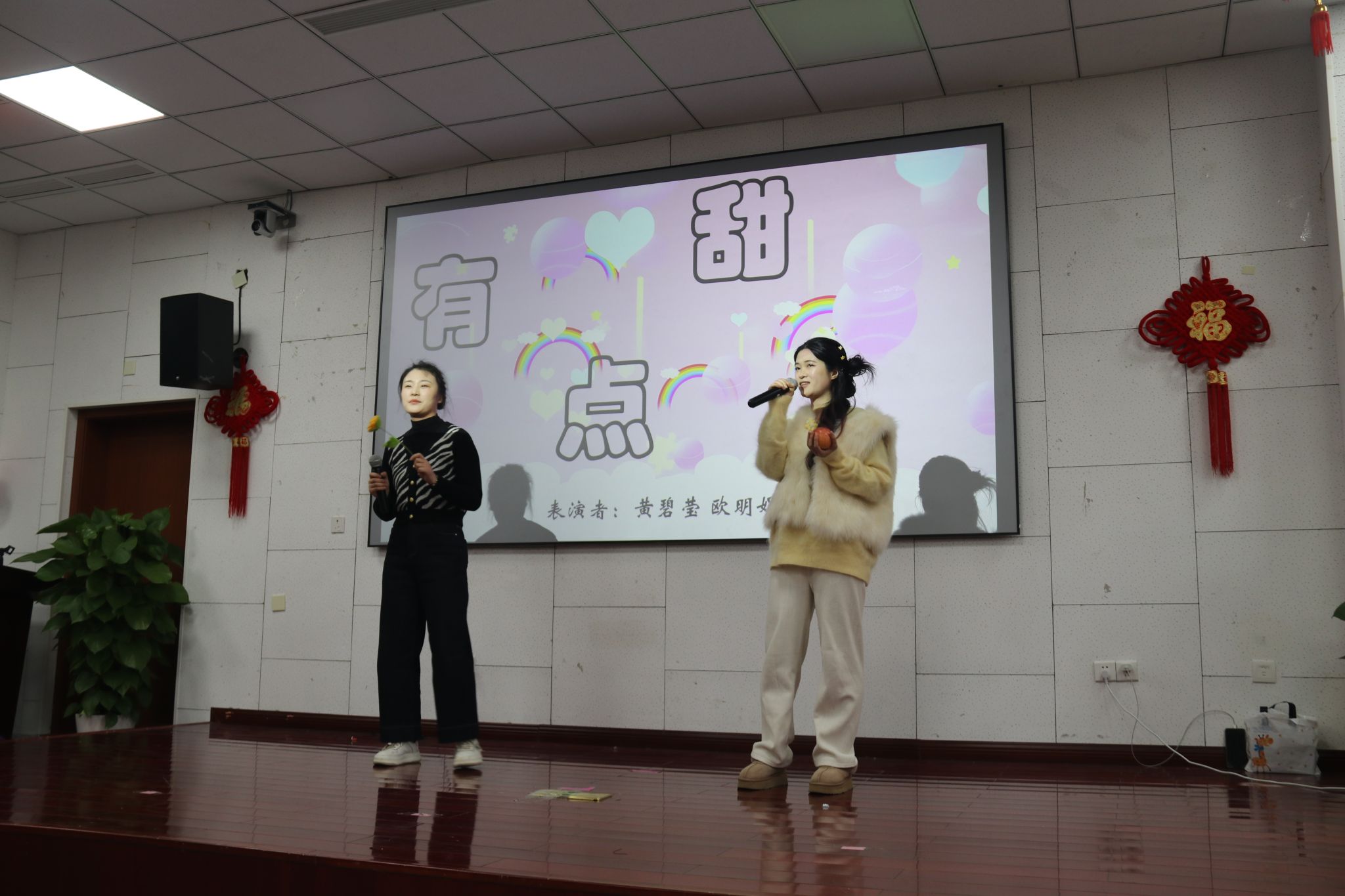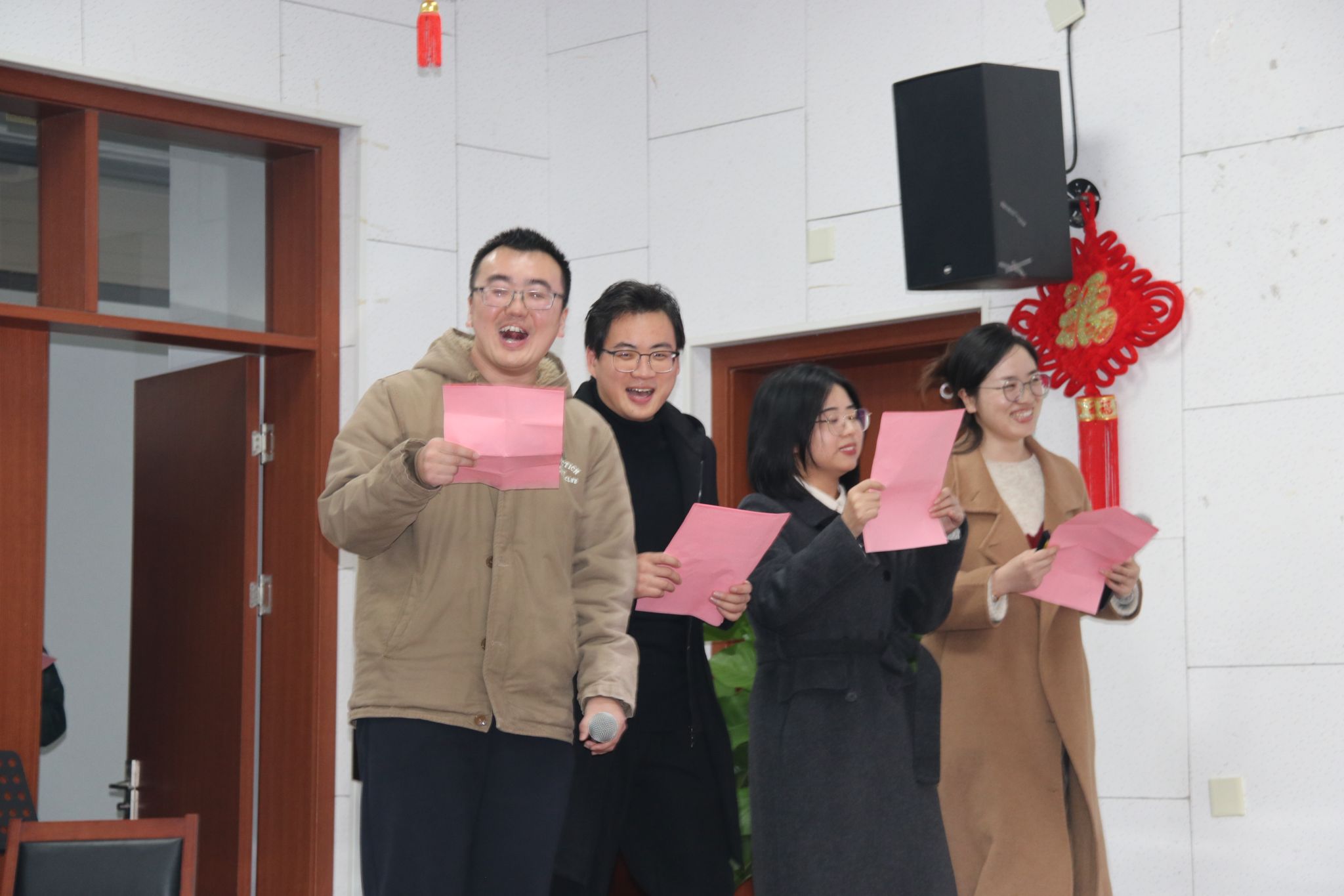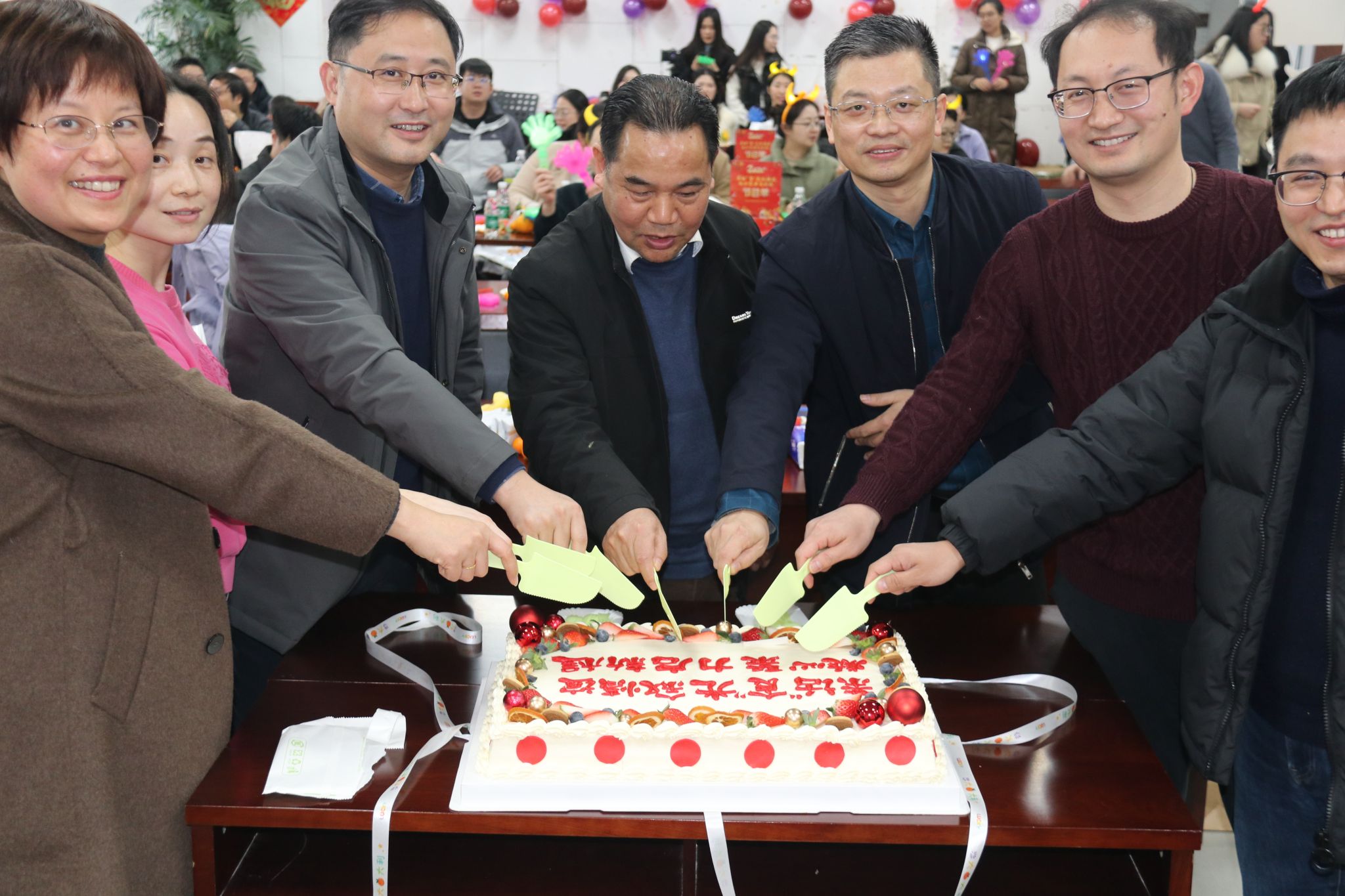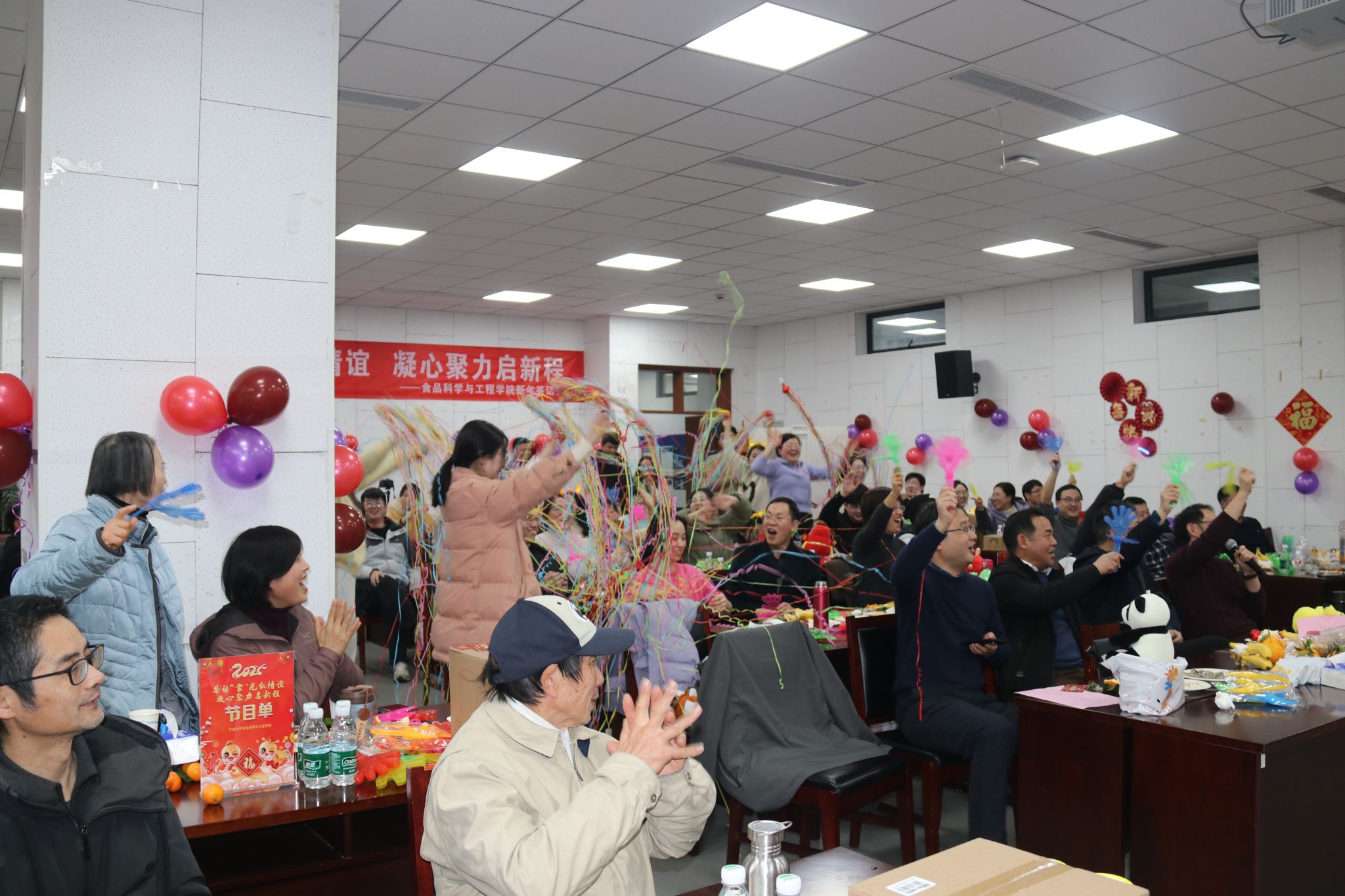 茶话会节目,在舞蹈《新年快乐》中拉开序幕。大家纷纷展示才艺,合唱《有点甜》,吉他弹唱《奔跑》,朗诵《我爱上班》,独唱《忘了你忘了我》,舞蹈《后宫蛙蛙传之鸿眉乱舞》,合唱《孤勇者》,合唱《明天会更好》游戏“套圈”“夹珠子”“传乒乓球”等节目精彩纷呈。期间,还穿插了抽奖等互动环节,分享了象征学院事业蒸蒸日上的蛋糕。现场气氛热烈,掌声、喝彩声此起彼伏。