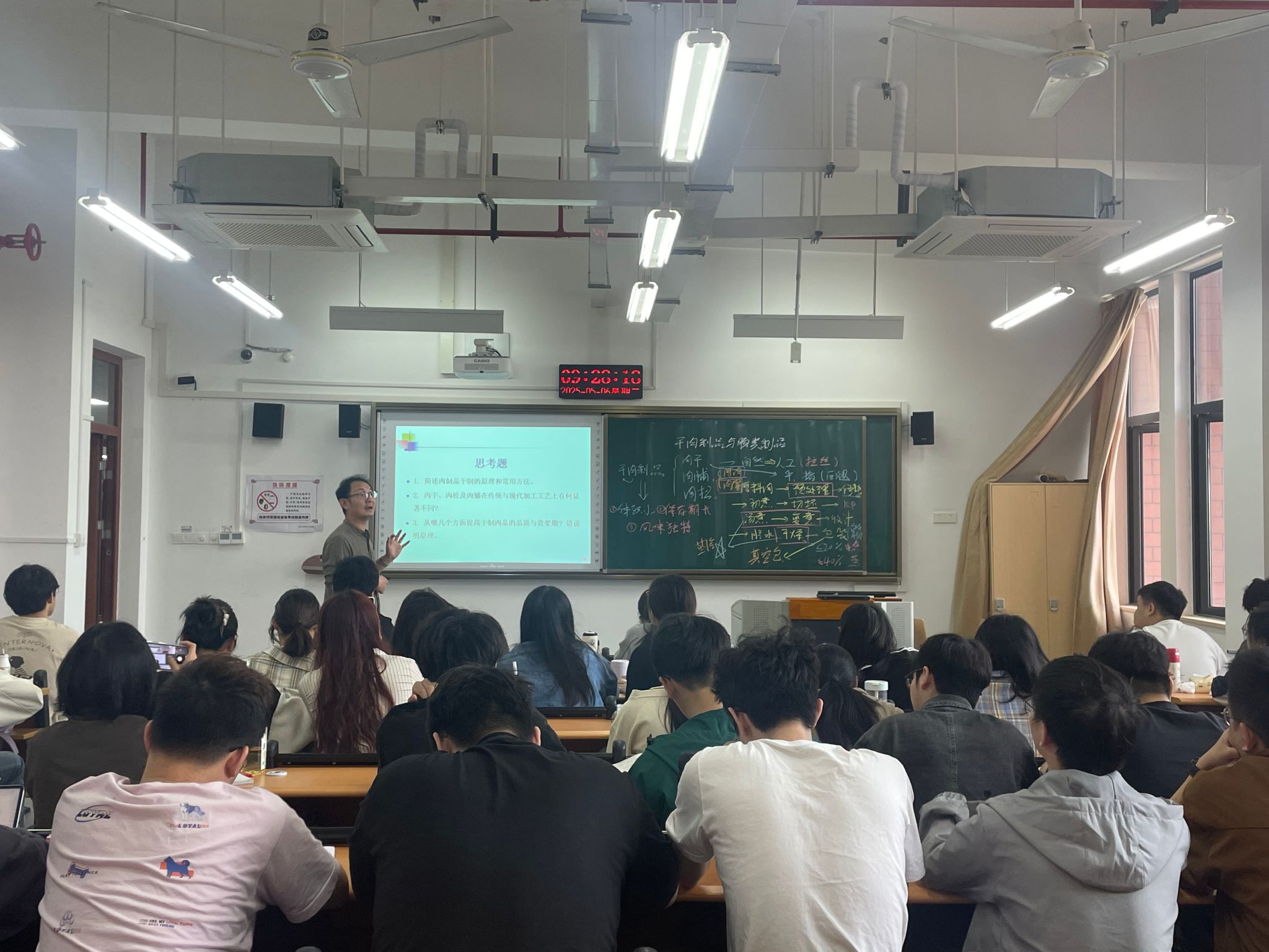 本次课程主要讲解 “干肉制品与肠类制品”加工工艺。吴振教授通过雨课堂动态二维码实现高效签到,依托弹幕互动实时收集学生反馈,充分体现工程认证对学生全覆盖和课堂参与度的要求。课程伊始,吴振教授以清晰的课程目标与毕业要求关联矩阵为引导,系统讲解了干肉制品的定义、分类及加工工艺,结合国家标准和产品质量控制体系,强化学生专业素养。