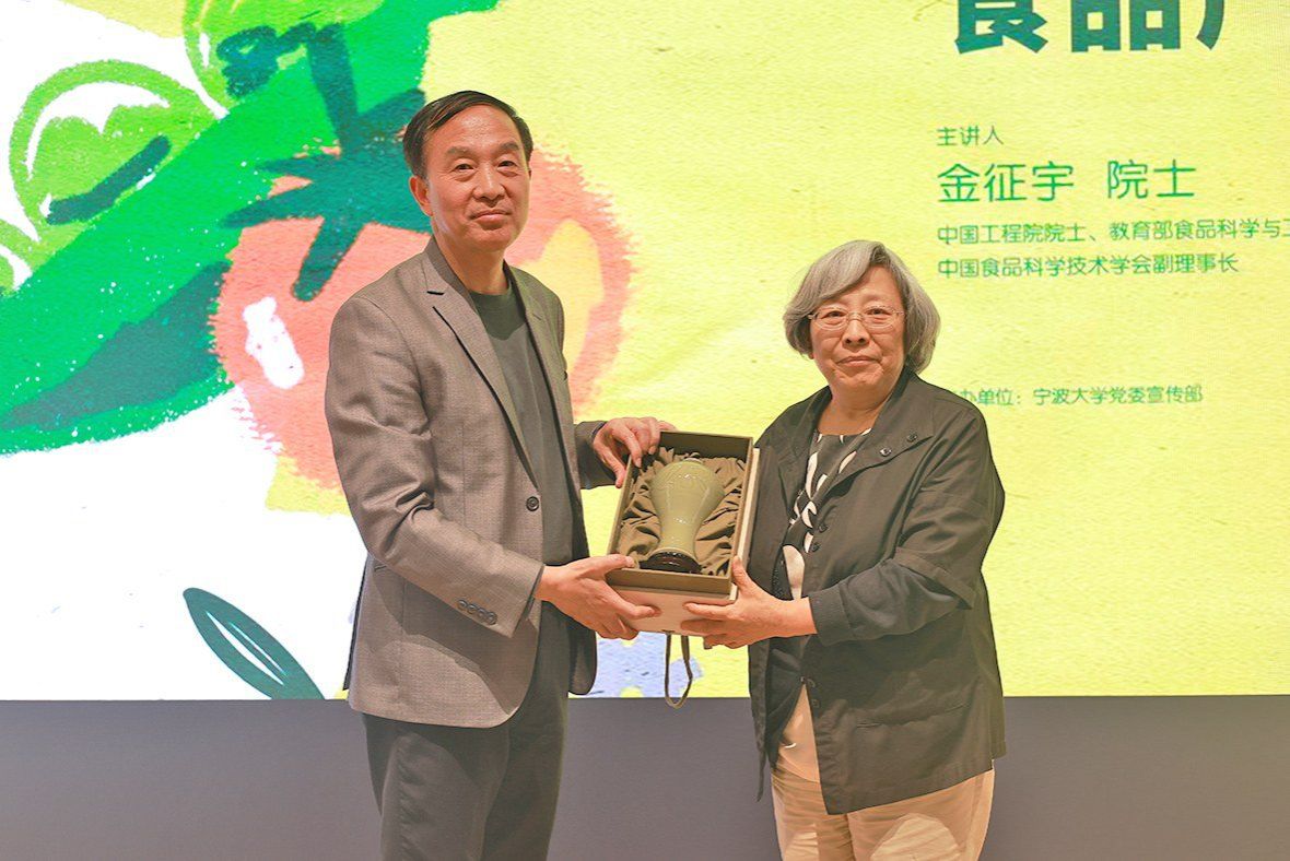 讲座结束后,赵玉芬院士代表学校向金征宇院士赠送了象征宁波文化底蕴的“古越青瓷”纪念品,寓意此次讲座如同古越青瓷一般,字字温润,意蕴深远,值得永远珍藏!