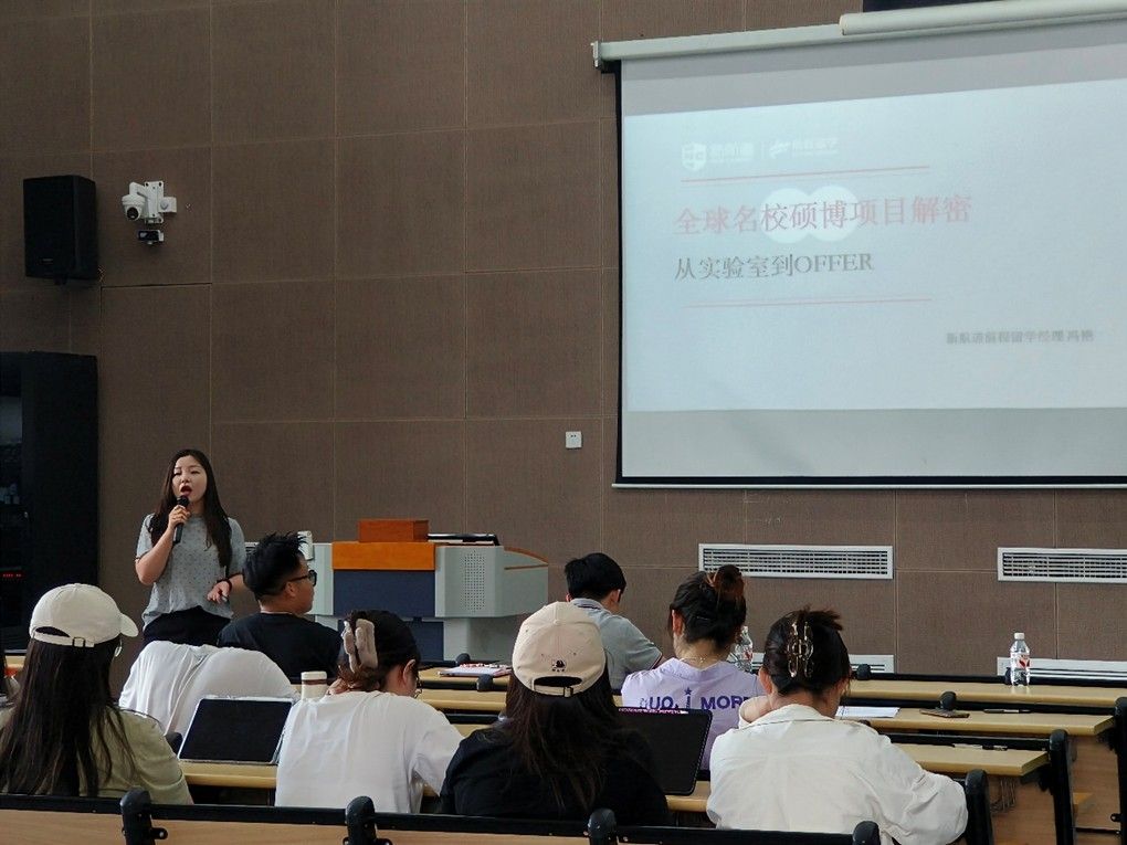 新航道前程留学经理冯艳则带领同学们将目光投向国际舞台,分享了全球名校硕博项目申请的宝贵经验。冯经理强调,在留学申请中,科研经历与学术成果是叩开名校大门的关键钥匙。她建议同学们尽早参与科研项目,用实打实的成果充实个人履历。此外,冯经理还化身“申请攻略达人”,从个人陈述的情感表达技巧,到推荐信的选择与撰写要点,一一进行细致讲解,帮助同学们提前做好留学申请的全方位准备。