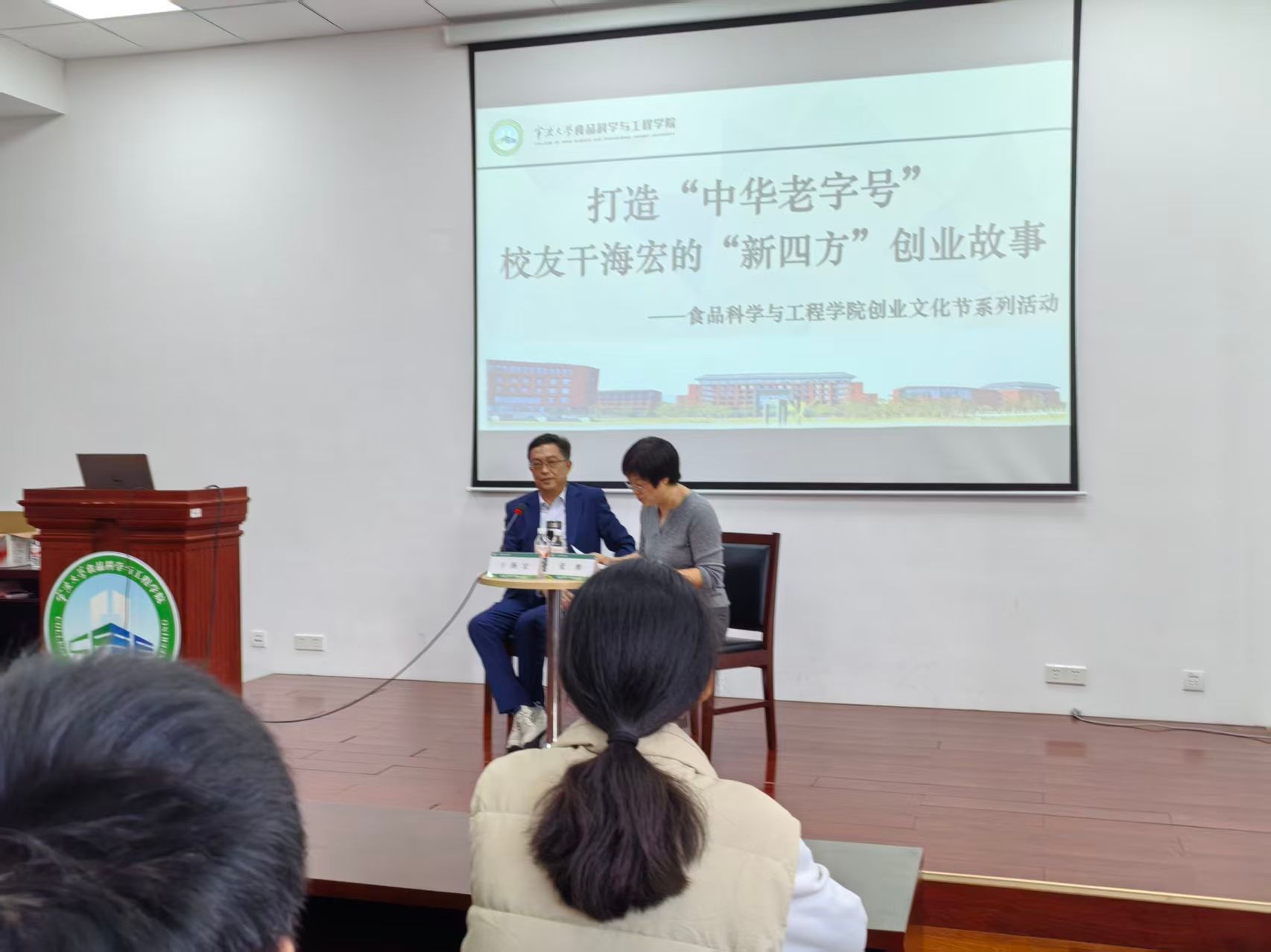 在竺银康楼120会议室成功举办校友创业分享会。优秀校友干海宏先生回归母校,以“打造‘中华老字号’”为主题,深情讲述了他创立并发展知名食品品牌“新四方”的艰辛与辉煌历程,为在校学子带来了一场关于梦想、坚守与创新的精神盛宴。在学院党委副书记张维的主持下氛围活跃、反响热烈。