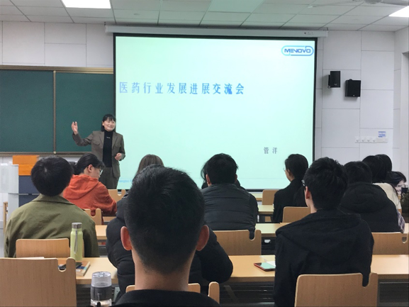 2019年4月3日,食品与药学学院邀请了宁波市知名药企美诺华药业股份有限公司董事会办公室战略发展副总管洋到梅山校区海洋药学院进行行业发展交流,并有幸邀请其为16级海洋药学的学生开展了一堂以《中国近年医药发展》为主题的实践分享课。