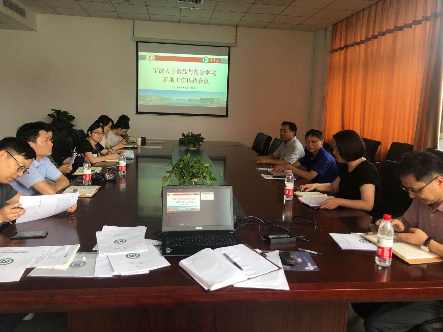2020年6月9日下午,食品与药学学院在梅山校区竺银康楼202召开会议,传达学校近期工作会议的相关通知,全体院领导、系所负责人、教工党支部书记、各办公室主任、实验室主任参加了会议。