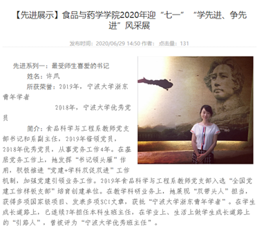 “红色印迹,薪火相传”食品与药学学院党员暑期社会实践团的队员们,7月4日,实地采访了北仑社会组织红十字会志愿者李甬江和陈俊,倾听它们的抗疫故事;7月5日,奔赴北仑采访了宁波日虹压铸制品有限公司董事长—陆华裕,从1971年开始创业的他,凭借着超前的眼光和百折不挠的毅力铸就了今天的辉煌;7月9日,采访了北仑区大碶街道横杨社区党委书记、居委会主任陆琪燕,在采访中,她提到自己是一名党员,是一名领导,在危难关头就需要有主动的意识,需要有吃苦在前的意识。7月11日,采访了贵州省清镇市中医医院巢凤院区急诊科护士长,抗疫期间担任贵州省将军山医院ICU重症监护室后勤保障质控组组长李筑湘。在抗击此次新冠肺炎疫情战役中,她冲在了战役的第一线。