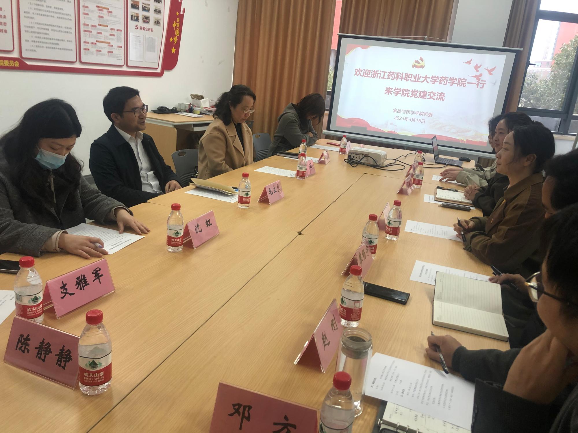 食品与药学学院全国样板党支部培育创建成果,对浙江药科职业大学药学院培育创建“第二批宁波市党建标杆院系”“宁波市样板党支部”颇有启发,对在食科系教师党支部建设中取得的工作经验与突出成绩给予高度肯定。随后双方就党支部建设、党建与业务“双融双促”等方面深入讨论,表示今后要继续加强交流互动,努力提高基层党建工作水平。