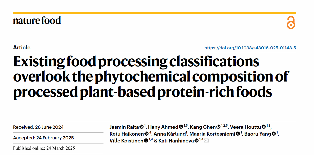 作为第二单位,在食品领域顶级期刊《Nature Food》发表研究论文。传统上,植物基高蛋白(PBPR)食品常被归类为“超加工食品”,并被认为不健康。但该研究指出,这类食品实际上富含多种有益健康的生物活性成分。