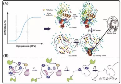 Figure. Schematic representation of the potential correlation between structural changes of protein under high pressure and the binding/release of volatile compounds (A), as well as of the pressure effects on dissociation with increasing HPP levels as exemplified by different domains (B).