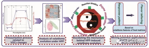 A critical examination of newly updated findings has suggested the non-negligible spatiotemporal HPP effects on the headspace volatile fingerprinting and flavor perception of pressurized foods. HPP-induced volatilome evolution results from the biochemical, physical, and chemical as well as metabolic effects of high pressure, and specific mechanisms depend on the features and manufacturing crafts of sample matrices, process variables and processing patterns. HPP shows its great potential as an aroma modification and flavor-tailoring technique, based on a comprehensive understanding of the mechanistic and quantitative relationship between volatilome evolution and process parameters.