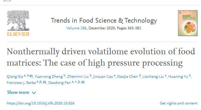 潘道东院长领衔的畜产品加工团队在国际食品领域顶级期刊《Trends in Food Science and Technology》(1区,IF=11.077)发表了题为“Nonthermally driven volatilome evolution of food matrices: The case of high pressure processing”的综述文章,潘道东教授为该文通讯作者,夏强博士为第一作者,农产品质量安全危害因子与风险防控国家重点实验室为通讯作者单位,合作单位还包括乳业生物技术国家重点实验室、瓦伦西亚大学以及澳门大学等。