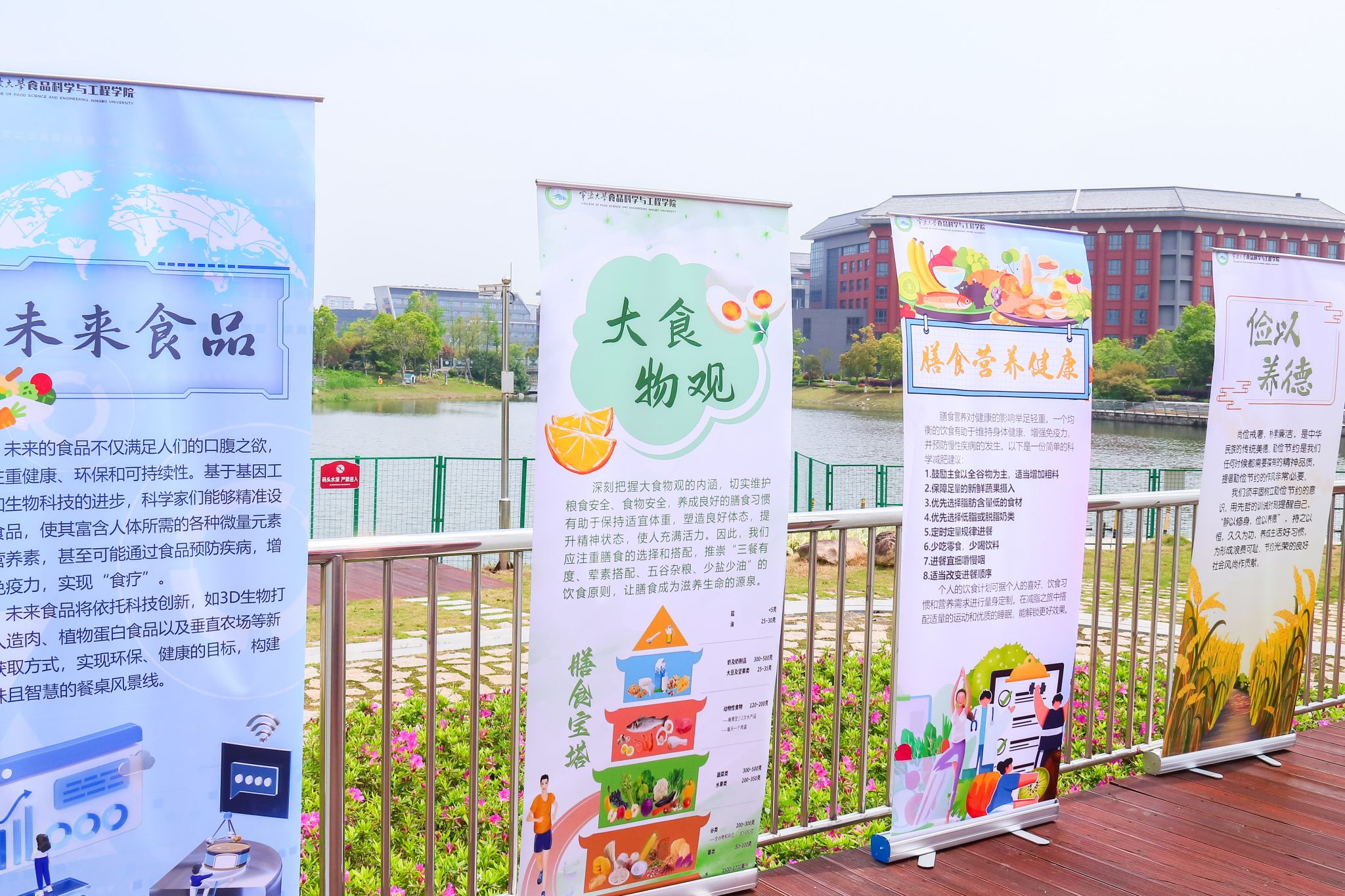 学院师生各展技艺,为大家呈现了一场风味美食的饕餮盛宴,风味猪肉干、桃疏果多糖饼干、“梅式”樱花老酸奶、植物基复合发酵酸奶、烤马面鱼片、叶酸强化型乳酸菌剂、甬城“益香”糟鸡等让同学们既饱口福又饱眼福。与此同时,在“大食物观”、“未来食品”、“膳食营养健康”等食品知识展板前更有不少同学驻足打卡,随处可见的“俭以养德”宣传海报更是引导着同学们勤俭节约、健康饮食、快乐成长。