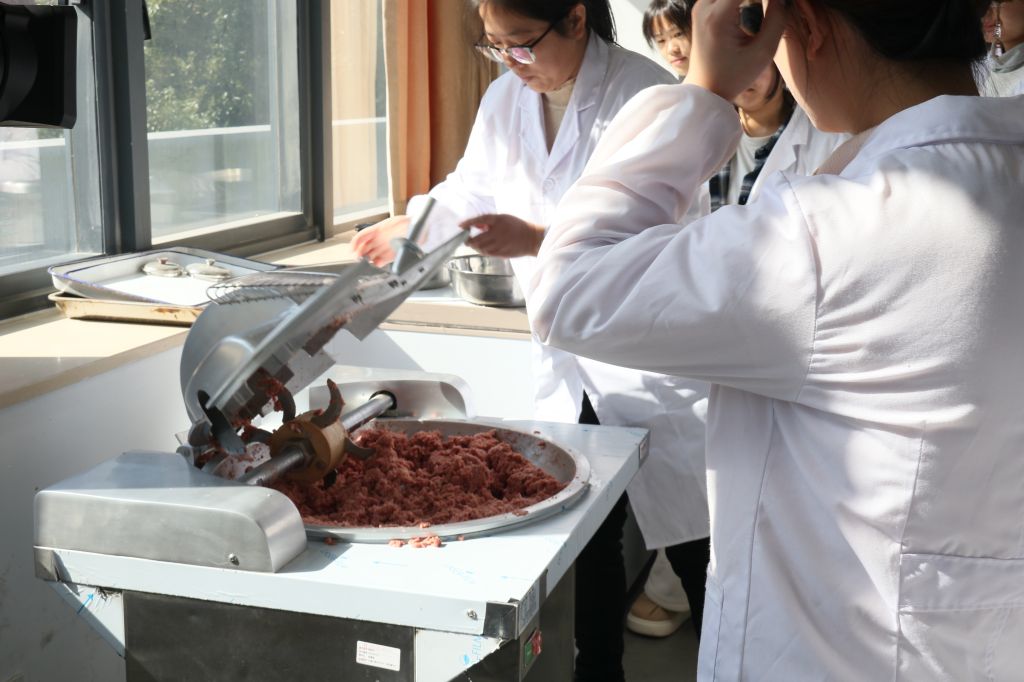 第一课堂上专业老师孙杨为学生们详细介绍了肉肠制作的具体过程,深入解释了其中涉及到的实验原理。这一过程使学生们亲身感受到食品制作工艺的原理,打开了一扇通向专业知识深度理解的新大门,使他们更加深刻地理解与掌握专业知识。
