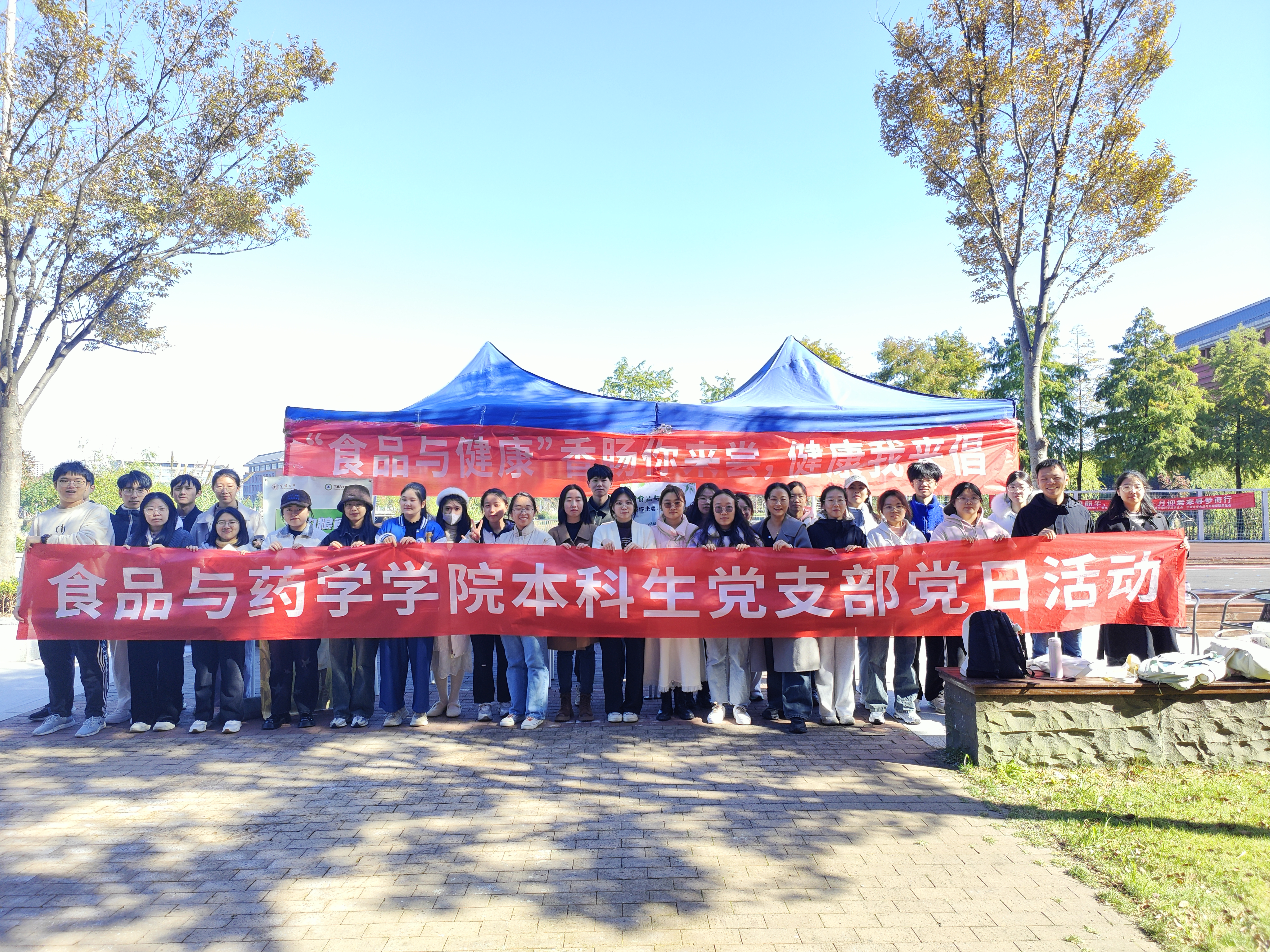 香肠制作完成后,本科生党支部的党员们将制作好的香肠带到阳明湖畔广场,开展了“食品与健康”学科文化节之香肠你来尝,健康我来倡主题党日活动。在品鉴香肠的同时,党支部志愿者向同学们传递了关于中国居民膳食宝塔、平衡膳食八准则以及廉洁奉公,节约粮食等方面的知识,并开展了“我的劳动教育观”的街头采访视频。本次活动不仅倡导健康膳食理念,同时也提高同学们热爱劳动、珍惜劳动成果的意识