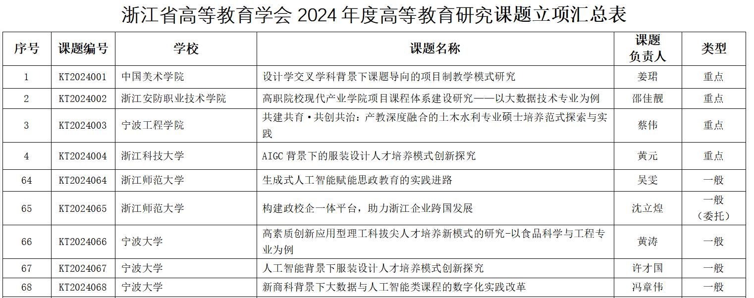2024年5月28日,“浙江省高等教育学会2024年度高等教育研究课题”立项公示,其中无码蜜桃臀 黄涛特聘研究员申报的“高素质创新应用型理工科拔尖人才培养新模式的研究-以食品科学与工程专业为例”成功立项。该项目的成功立项对无码蜜桃臀 食品科学与工程学科育人发展具有重要推动作用。