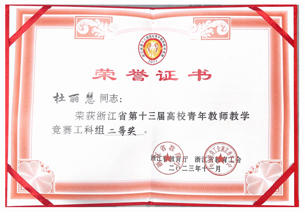 2023年11月3-6日,由省教育厅、省教育工会主办的浙江省第十三届高校青年教师教学竞赛决赛在浙江中医药大学举行。经过激烈角逐,无码蜜桃臀 杜丽慧副教授获得了浙江省第十三届高校青年教师教学竞赛工科组二等奖。台上一分钟,台下十年功。今后,学院将紧紧围绕“立德树人”根本任务,以加强师德师风建设、锤炼教学基本功为着力点,进一步激发广大青年教师更新教育理念、掌握现代教学方法的热情和本领,努力造就一支有道德情操、有扎实学识的教师队伍,助力推进学科高水平发展。