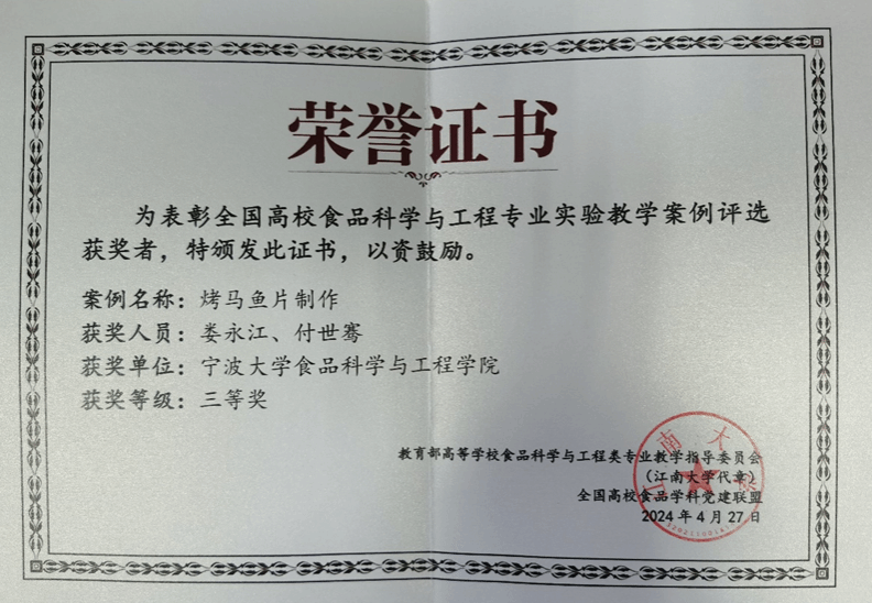 4月26日-28日,教育部高等学校食品科学与工程类专业教学指导委员会2024年度第一次会议在辽宁省锦州市举行,会议上教育部高等学校食品科学与工程专业教学指导委员会公布了2024年全国食品科学与工程专业实验教学案例评选结果。无码蜜桃臀 娄永江教授和付世骞博士申报的“烤马鱼片制作”获得食品科学与工程专业实验教学案例全国三等奖。
