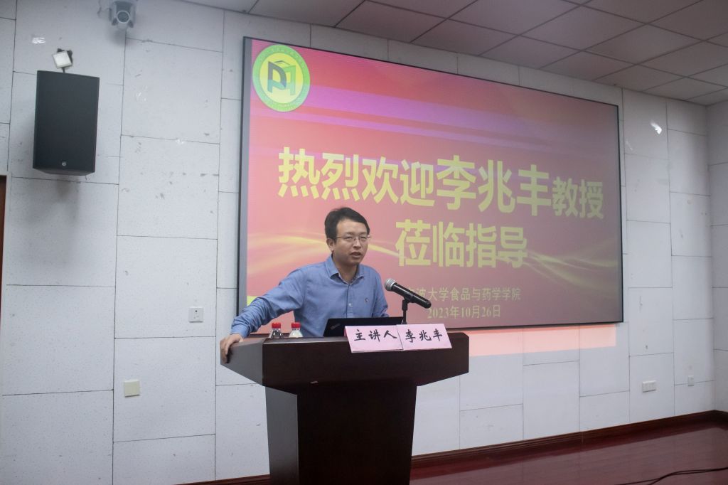 师生做《未来食品与淀粉生物技术》的学术报告。执行院长邵兴锋教授主持报告会,参与报告会的主要为食药学院教师和研究生。