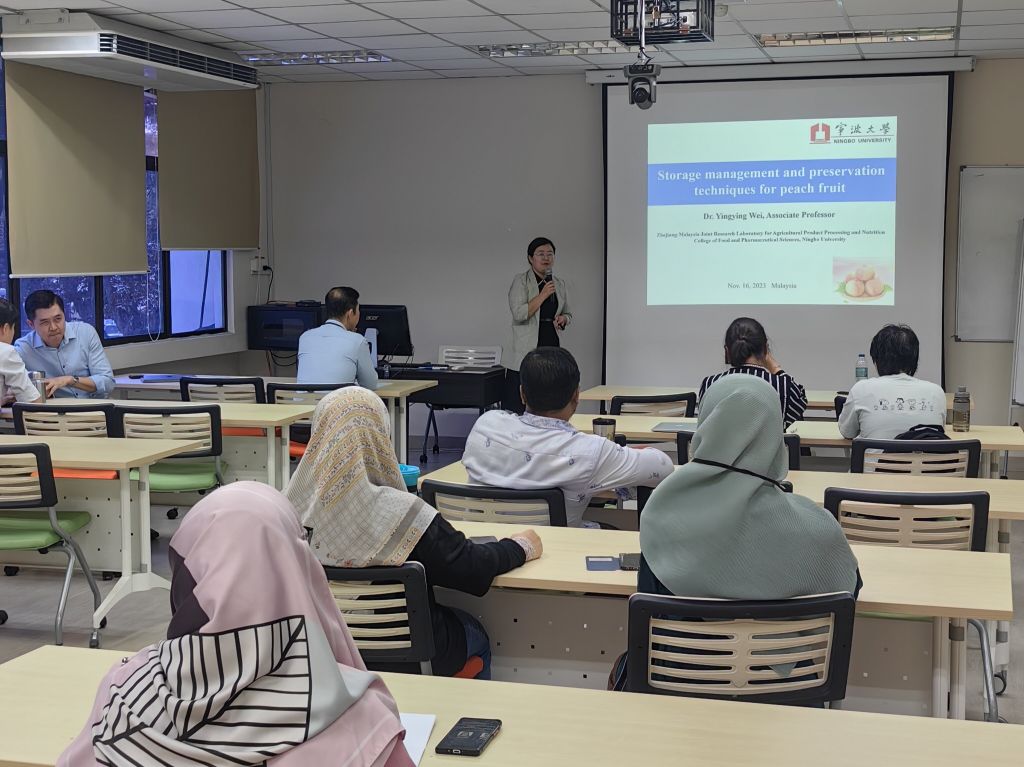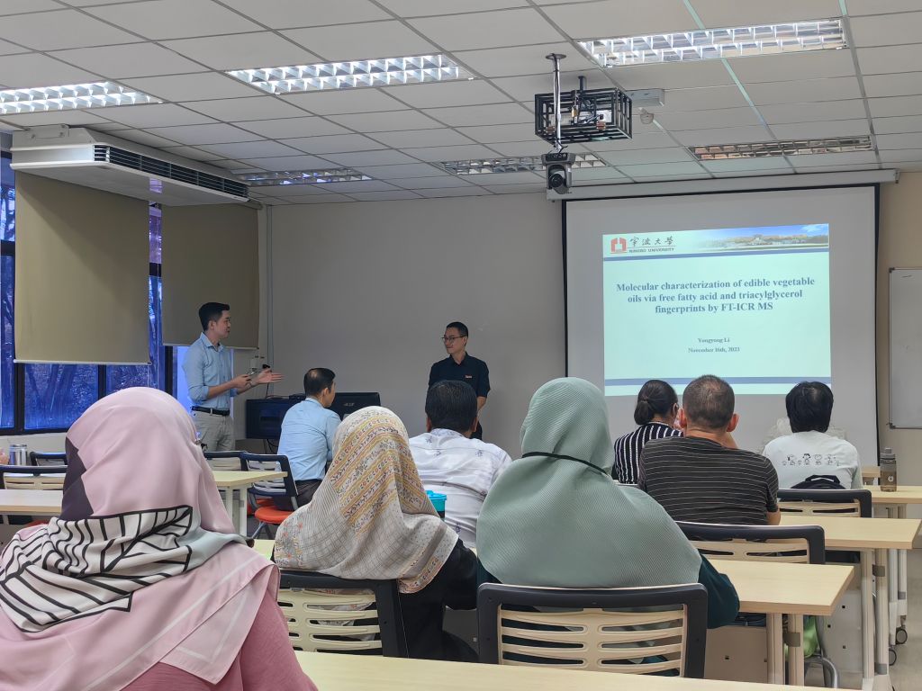 代表团举行了中方学术交流会,韦莹莹、李勇勇、杜丽慧(线上)分别做了 “Storage management and preservation techniques for peach fruit”、“Molecular characterization of edible vegetable oils via free fatty acid and triacylglycerol fingerprints by FT-ICR MS”和“The application of cold plasma treatment on animal protein modifications”,Chin Ping Tan院士主持学术交流会,吸引了UPM多位师生的共同参与。