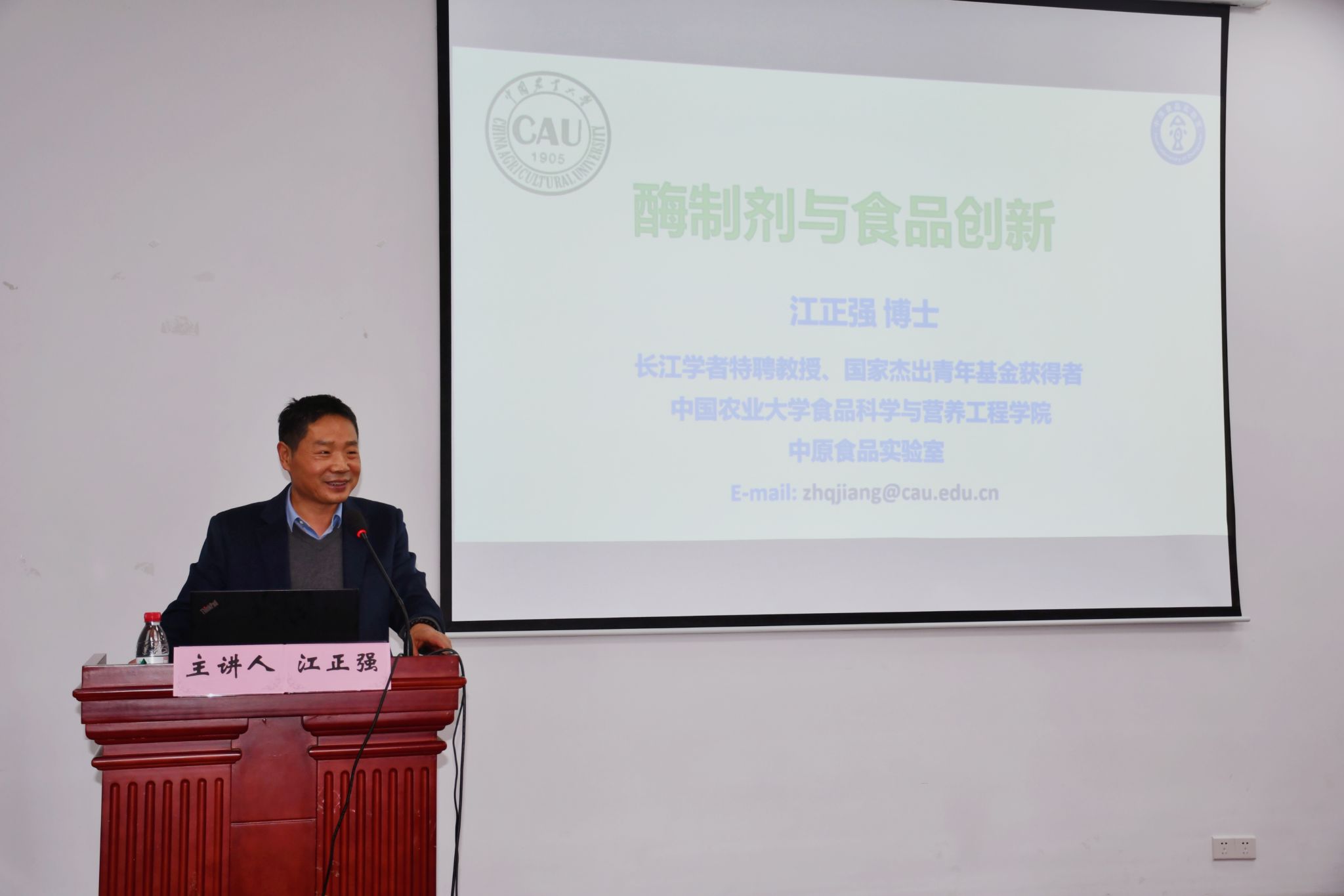 2023年11月29日下午14:00,中国农业大学食品科学与营养工程学院江正强教授在梅山校区竺银康楼120会议室做了《酶制剂与食品创新》的学术报告。特聘院长潘道东教授主持报告,执行院长邵兴锋教授、党委书记龚文杰、副院长吴振教授、学院教师和研究生参加了此次会议。
