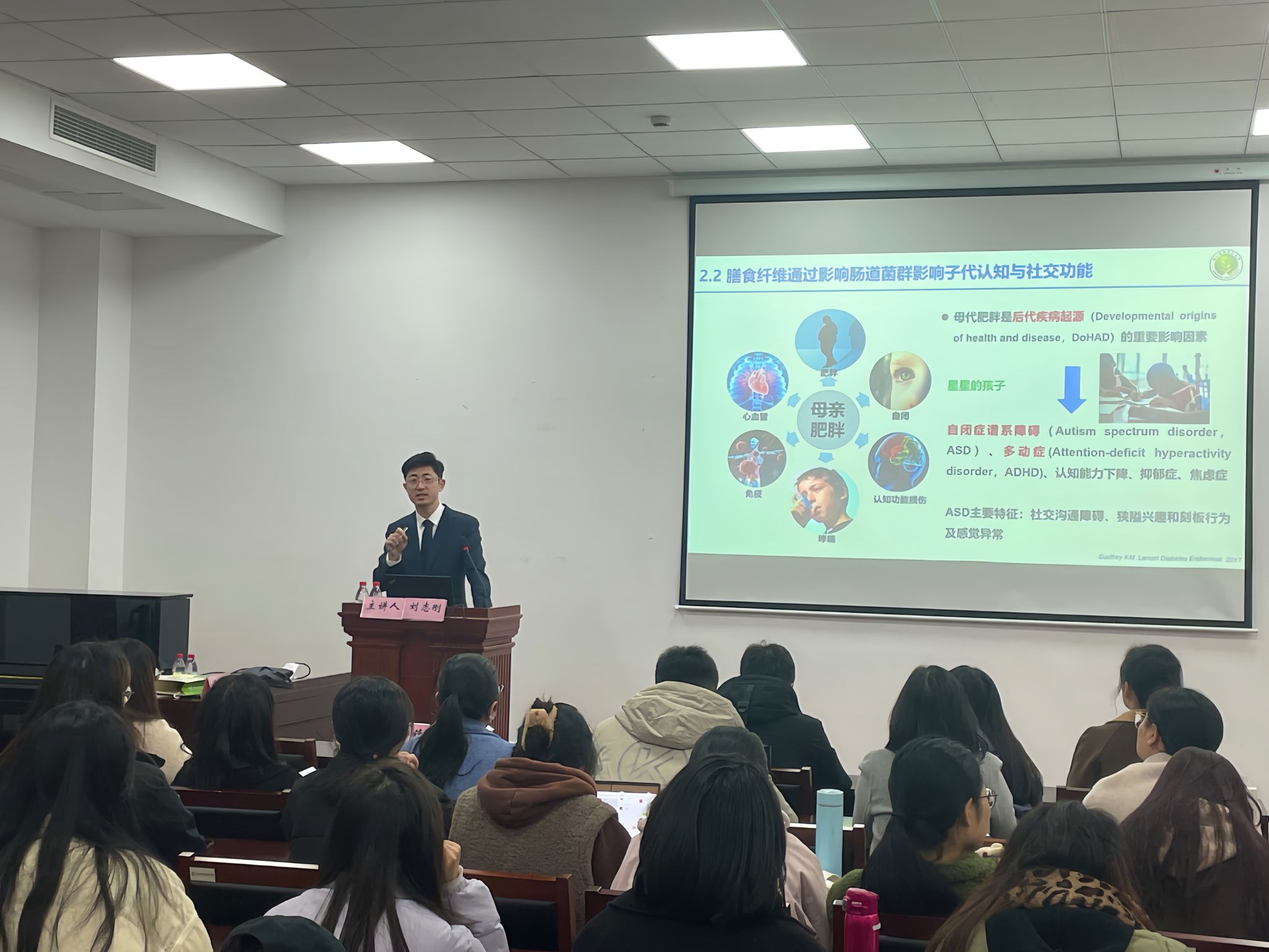 首先,刘志刚教授介绍食品分子营养与健康研究最前沿的学术观点和研究成果,帮助大家了解食品分子营养与健康领域的最新发展现状。随后,刘教授介绍了其团队在靶向肠脑互作的食品分子营养与健康的研究,研究发现魔芋低聚甘露糖(MOS)不仅对改善小鼠认知记忆能力和精神障碍具有显著的效果,还能抑制精神系统的精神炎症和氧化应激。此外,母亲孕前超重、肥胖会造成男性儿童的学习能力和社交能力显著降低,而补充膳食纤维可改善患有自闭症小鼠的社交障碍,减小社交新颖性偏好能力的损伤。
