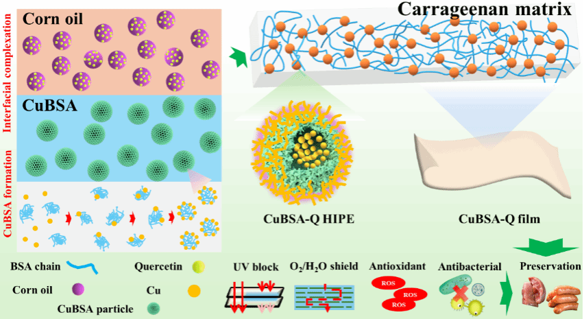 在食品保鲜领域,单一卡拉胶薄膜在长期贮藏过程中常面临结构硬化、吸水膨胀及性能劣化等挑战,严重限制其在肉制品保鲜中的应用。本研究提出一种基于双稳定机制的高内相乳液填充复合膜技术,通过铜离子整合与槲皮素介导的界面络合协同作用,开发出新型多功能保鲜材料,为鸭肉肠制品的高效保鲜提供了新解决方案。