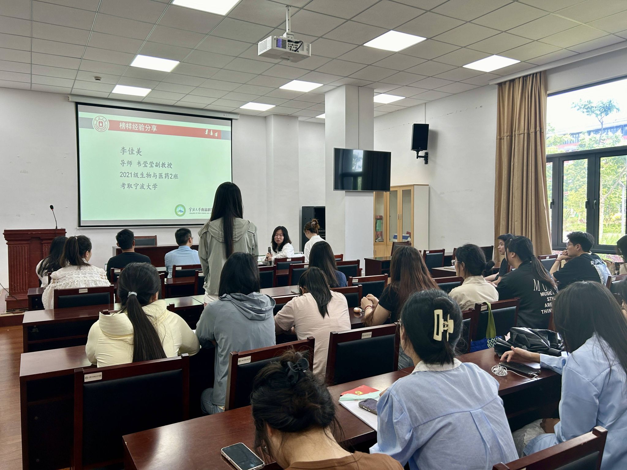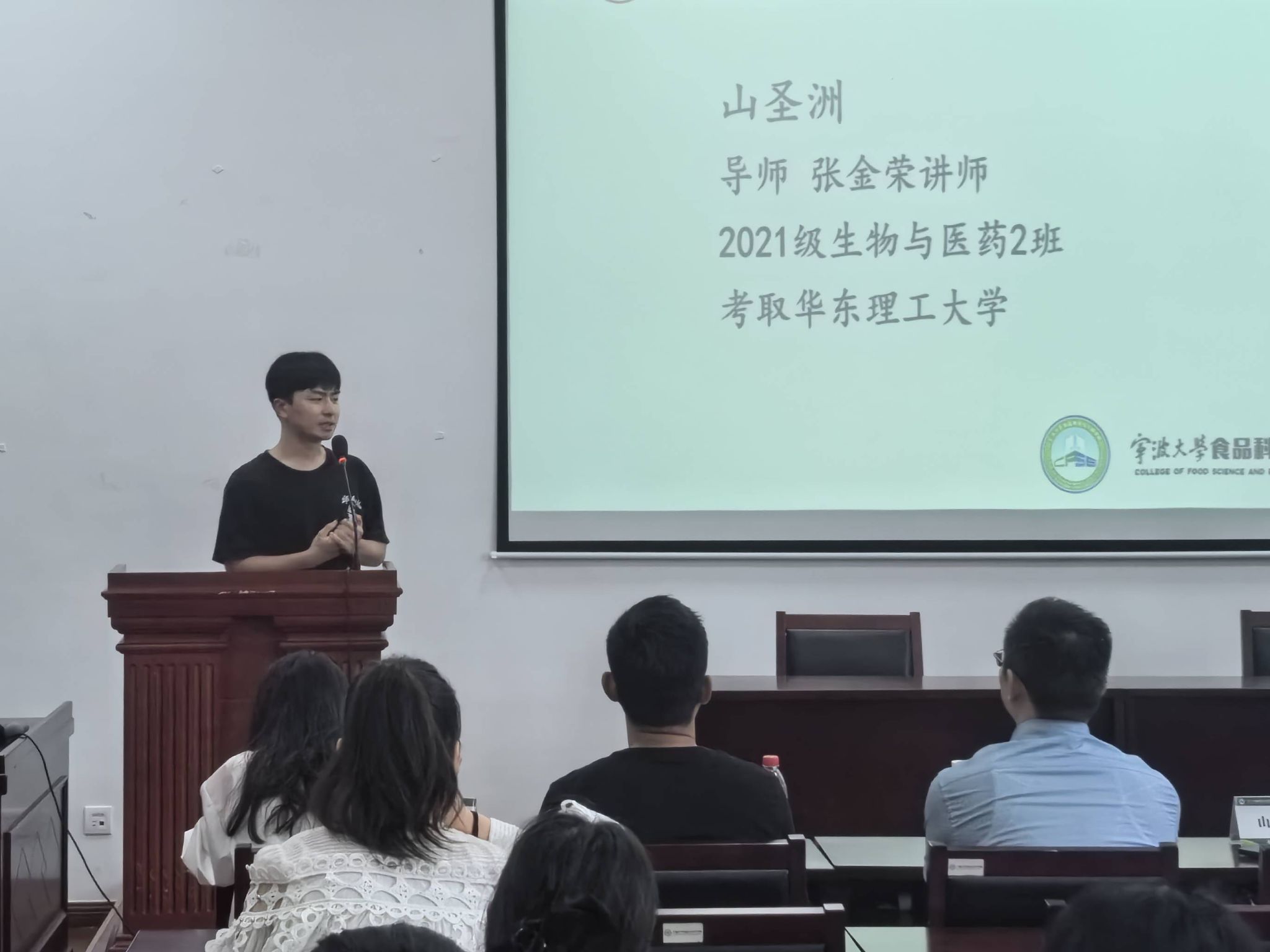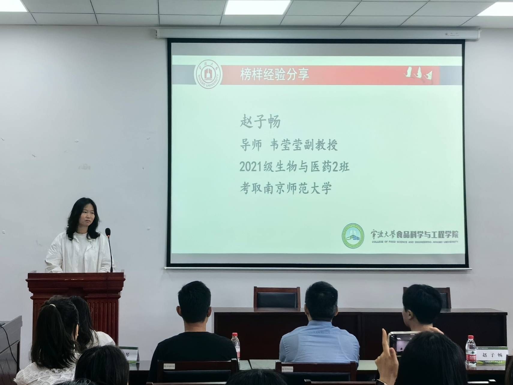 交流会伊始,阮怡清老师简要介绍了到场的嘉宾,并代表学院致以热烈的欢迎。随后,陈琴、韩传虎、山圣洲、赵子畅、李佳美五位已经考取博士的同学依次上台,结合个人考博经历,分享了宝贵的备考经验和备考建议。他们分别从申博流程、考试内容、面试技巧、学校和导师的选择等多个方面进行了深入剖析,为正处于未来道路抉择的同学们点亮了一盏明灯。
