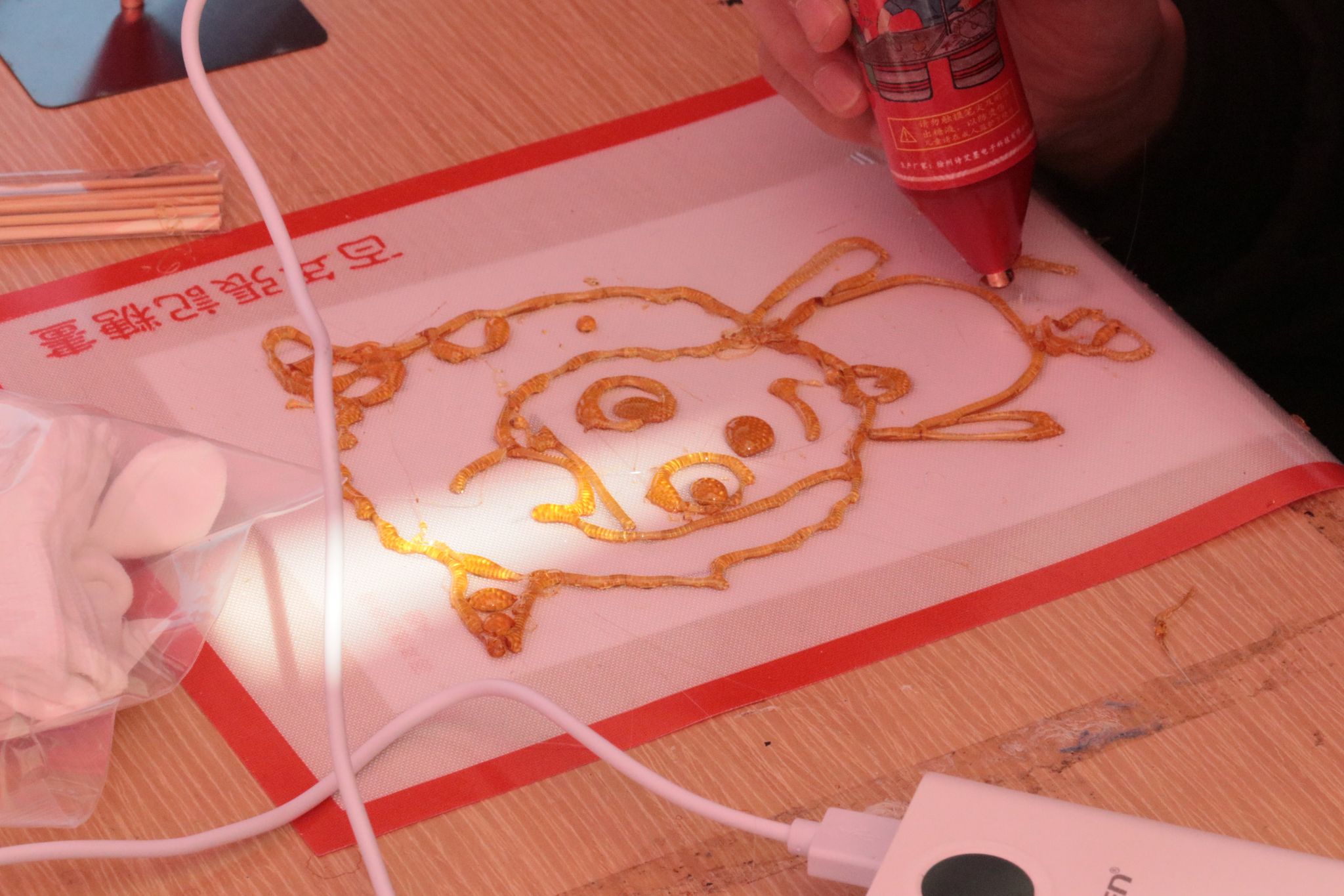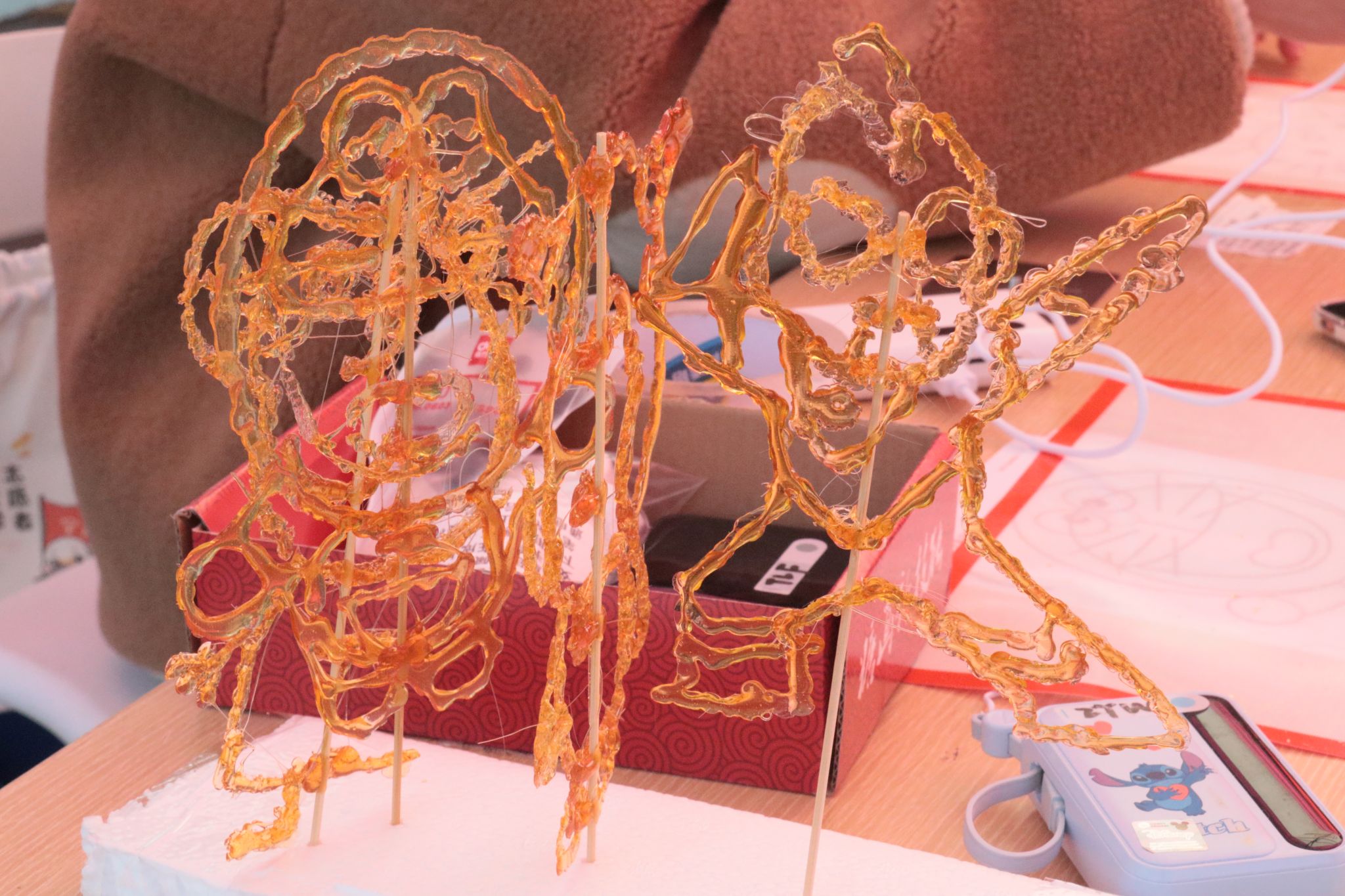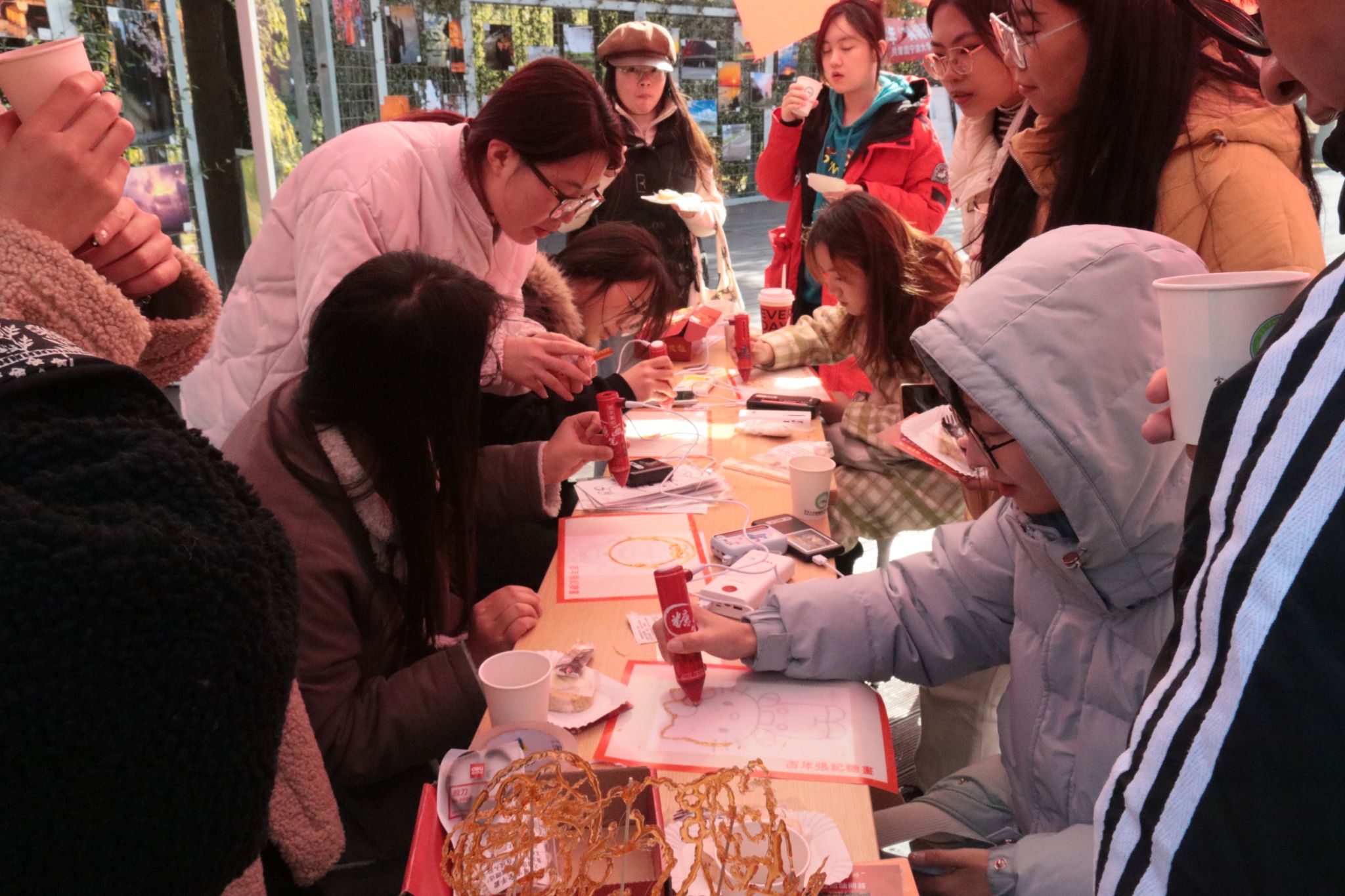 线下非遗糖画制作专区无疑是本次活动的焦点所在,同学们手握糖勺,随着手腕时抖时顿,顷刻间一个个栩栩如生的动漫造型便跃然纸上,待糖画凝固后,只需用竹签轻轻一粘,一份独特的糖画作品便宣告完成。