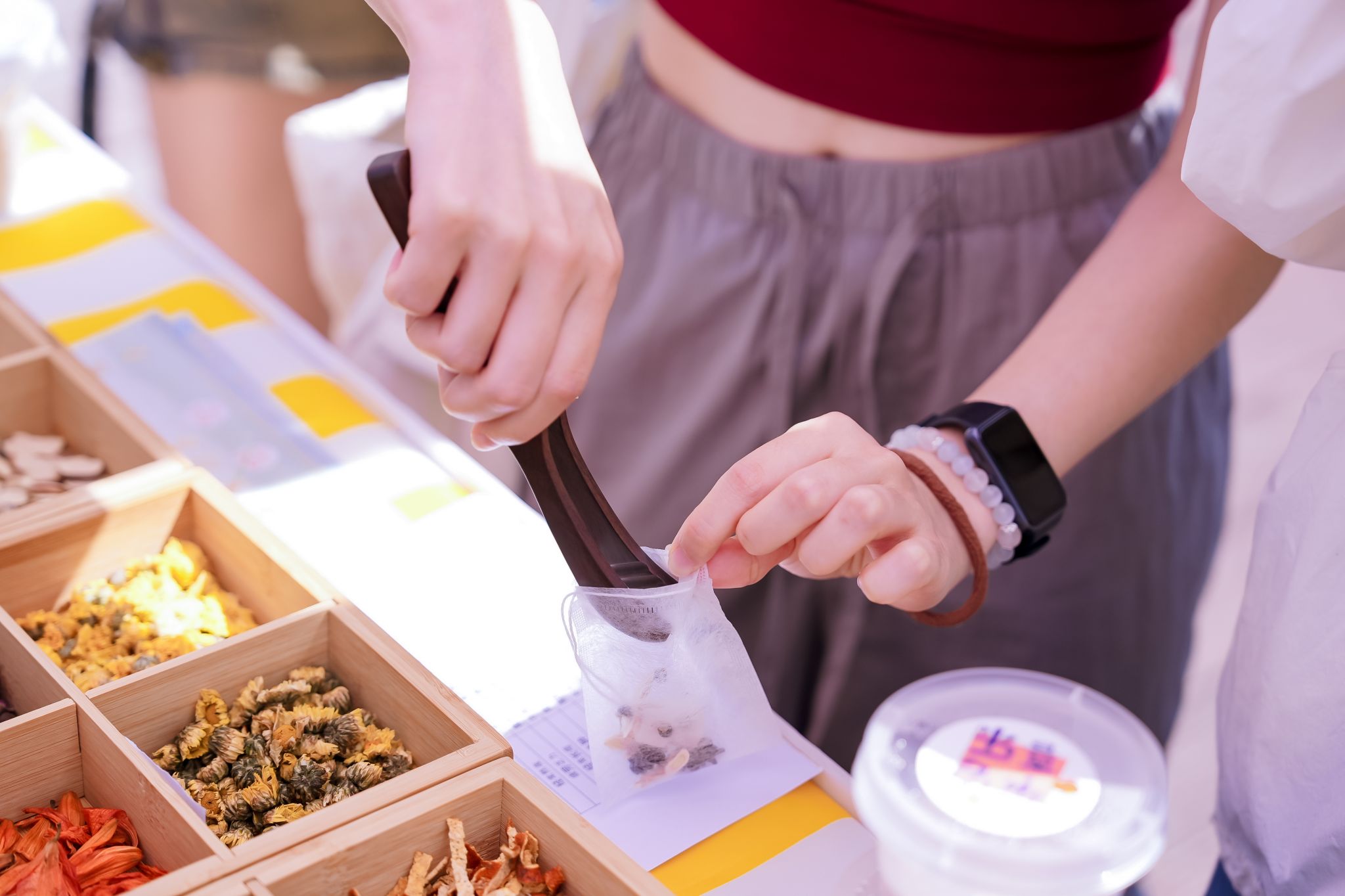 当非遗美食的香气在指尖流转,“食”光物语非遗美食DIY区以一场沉浸式手作盛宴,将活动氛围推向最高潮。展区聚焦传统酿造、手工点心等技艺,通过图文并茂的展板和实物陈列,系统梳理传统食品的历史渊源与制作技艺,让师生在品尝非遗美食的同时,感受中华饮食文化的博大精深。在专业教师和研究生团队的指导下,参与者亲手制作传统中式糕点桔红糕与养生花茶。从揉制糯米粉团到调配花茶配方,每个步骤都渗透着传统饮食的智慧:桔红糕的制作还原了古法手工技艺,强调“慢工出细活”的匠人精神;养生花茶的搭配则结合现代营养学,让参与者在个性化创作中体会“药食同源”的养生理念。“原来传统美食里藏着这么多科学门道,自己动手更觉得每一口都充满文化韵味。”一位参与者感慨道。