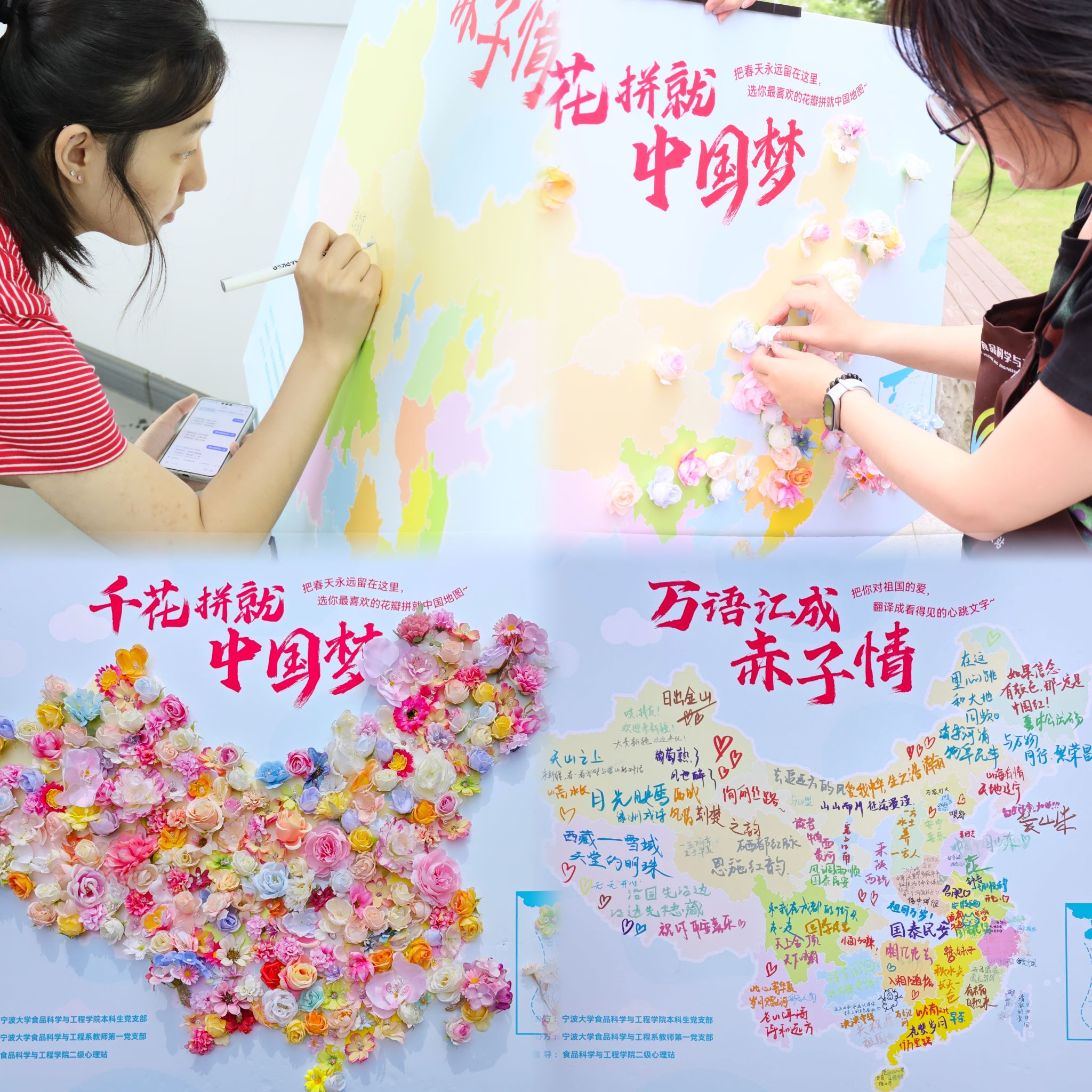 值得一提的是,本次活动巧妙融入思政元素,实现心理健康教育与思想引领同频共振。在“千花拼就中国梦”环节,同学们精心挑选心仪颜色的花瓣,凭借细腻的心思与灵巧的双手,共同拼绘出一幅鲜艳夺目的中国地图;在“万语汇成赤子情”环节,大家将对祖国的炽热情怀化作灵动的文字,以极具创意的方式抒发内心深处的真挚情感。这场充满趣味与解压感的活动,不仅引导同学们学会关爱自我,更让家国情怀在每位参与者心中悄然扎根。