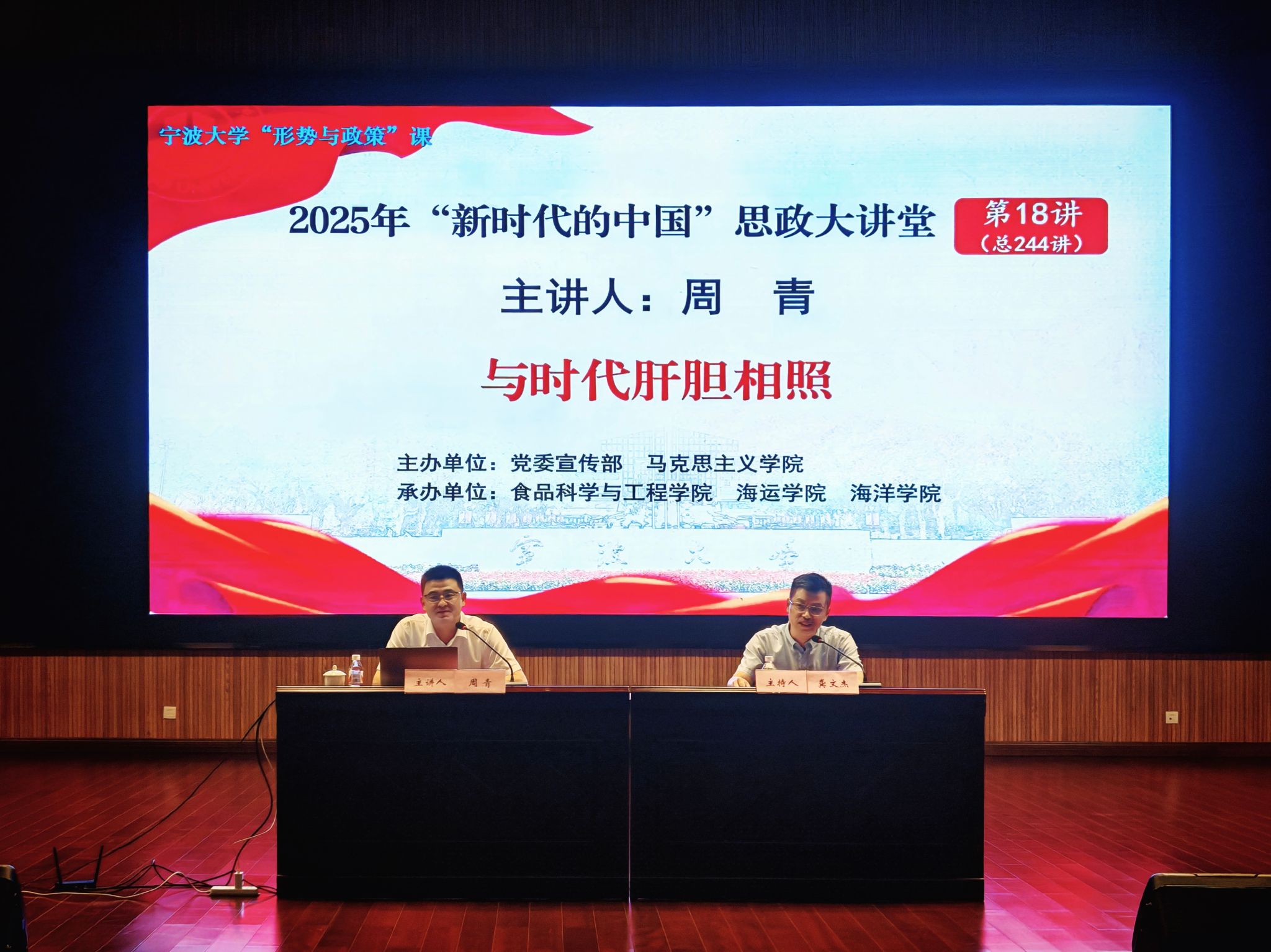 5月30日下午,校党委委员、副校长周青“与时代肝胆相照”为主题,在梅山校区叶袁玉卿大会堂为无码蜜桃臀 、海运学院、海洋学院师生主讲“形势与政策”课无码蜜桃臀 党委书记龚文杰主持讲座,梅山校区三个学院共计600余名师生参加本次专题讲座。