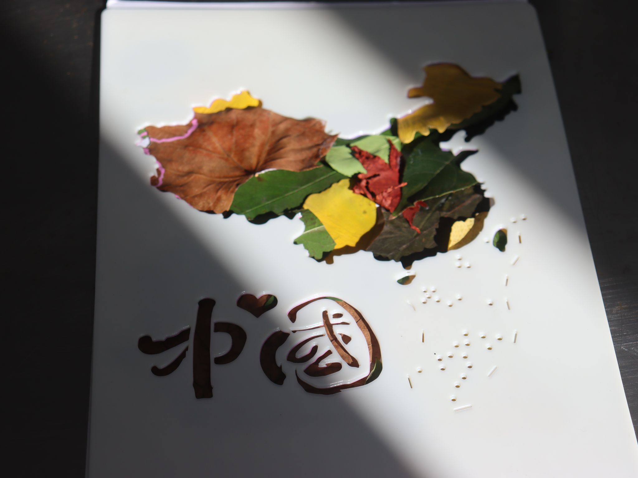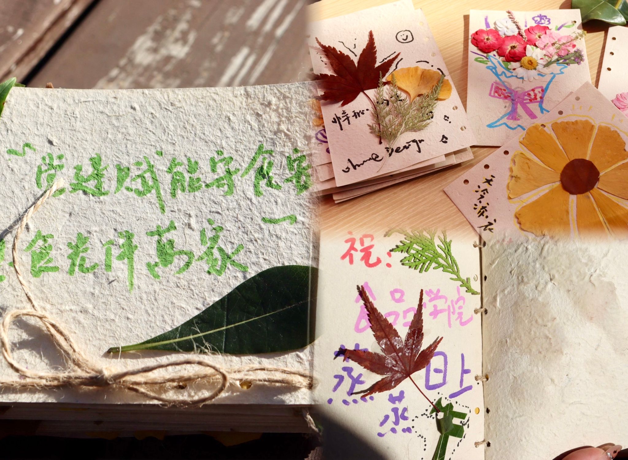 随着烘焙成品陆续冷却装盘,“叶抒红心・冬日暖情”主题互动同步启动,一片片落叶成为同学们传递心意、抒发情怀的独特载体,同学细心比对不同树叶的形状拼贴出轮廓清晰的中国地图,让爱国热忱在错落的叶脉间自然流淌;有同学用棉线将小巧的树叶串成精致项链,在打结固定的细节里倾注着温暖情谊;还有同学以树叶为装饰创作专属手帐,记录当下的心境和对未来的期许。