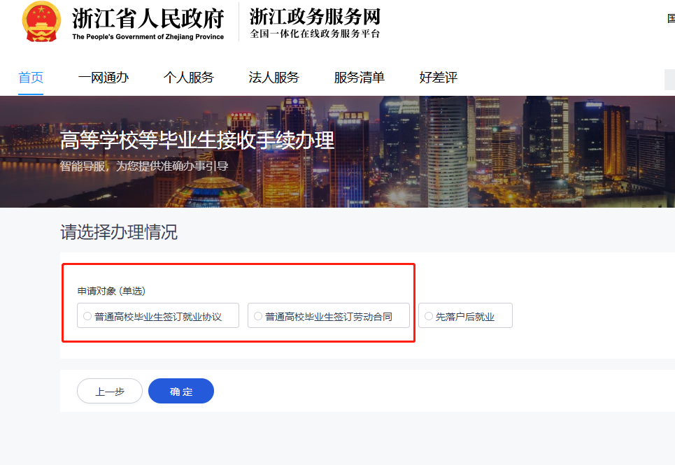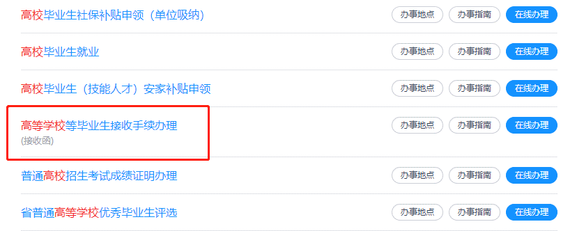 第一步:实名注册、登录浙江政务服务网主页 www.zjzwfw.gov.cn,搜索高等学校等毕业生接收手续办理,点在线办理