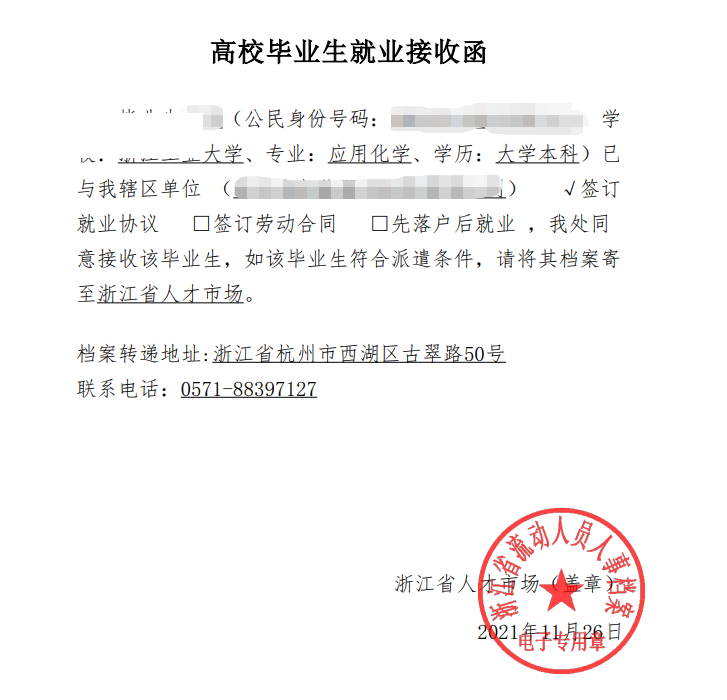单位性质为其他企业、民办学校等,就业协议没有加盖用人单位上级主管部门公章或毕业后直接与单位签订劳动合同的同学,需向单位所属人才管理机构申请就业接收函,毕业后报到证和人事档案派往就业地人才市场;未申请就业地人才市场接收函的,毕业后报到证和人事档案将派回生源地人才市场。浙江省就业如何申请接收函,简单四步: