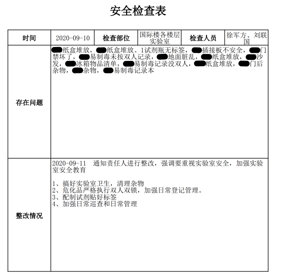 应对可能出现的实验室安全隐患,我们组织专人对各实验室安全状况进行排查,对其中存在隐患的部分提出整改意见,并由各实验室负责人进行落实。